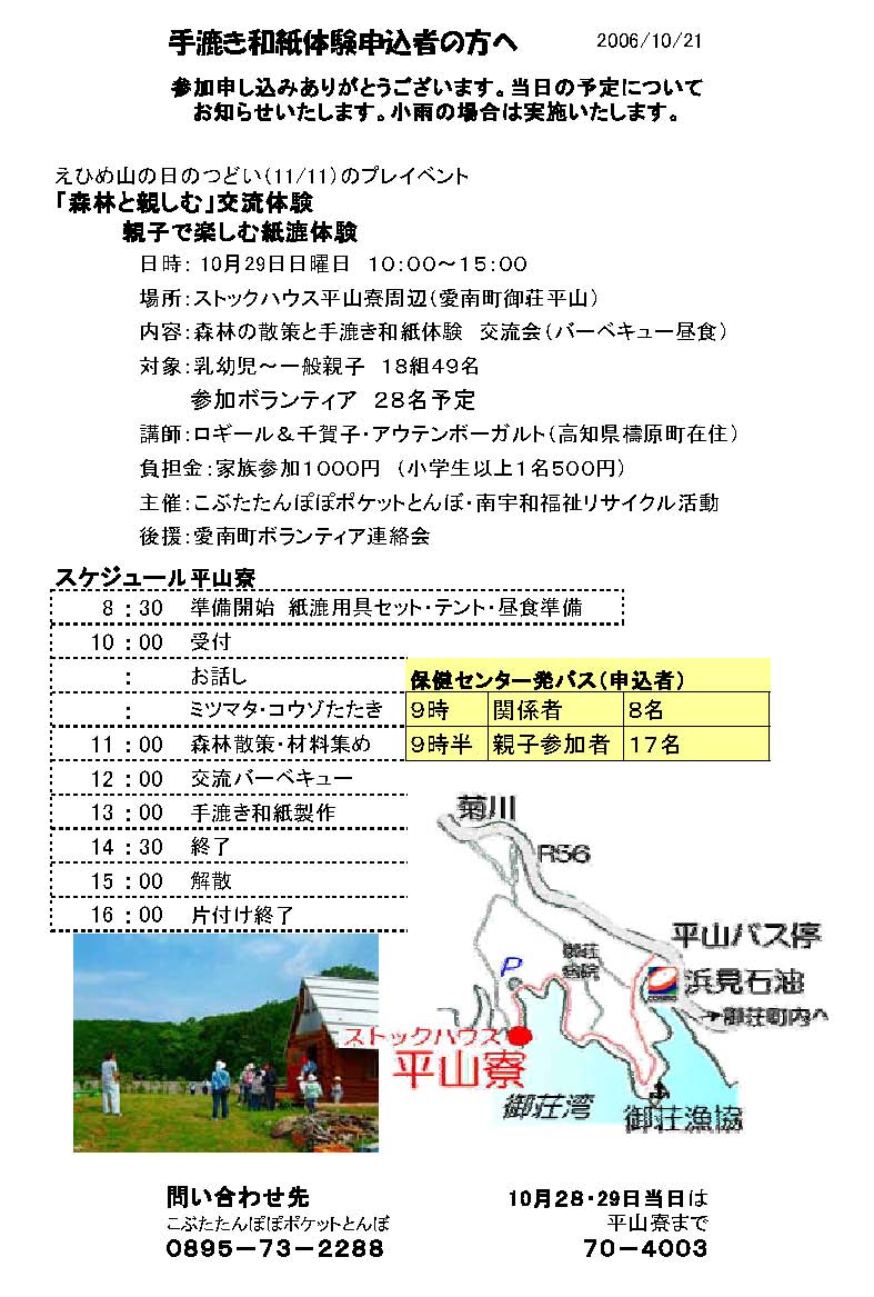 時間:10:00〜15:00 場所:ストックハウス平山寮周辺 (南宇和郡愛南町御荘平山 御荘漁協近く *駐車場あり*) 内容:森林の散策と手漉き和紙体験 交流会(昼食バーベキュー) 午前 コウゾ・ミツマタの準備と、 森林散策・竹炭体験(和紙に漉き込む材料集め) 午後 手漉き和紙作り 対象:乳幼児親子〜一般 先着40組程度予定(お一人でもどうぞ) (参加ボランティア 20〜30名予定) 講師:ロギール&千賀子・アウテンボーガルト(てんぐの風 高知県檮原町在住) 負担金:1名500円〜1組1000円 主催:南宇和福祉リサイクル活動・こぶたたんぽぽポケットとんぼ 後援:愛南町ボランティア連絡会