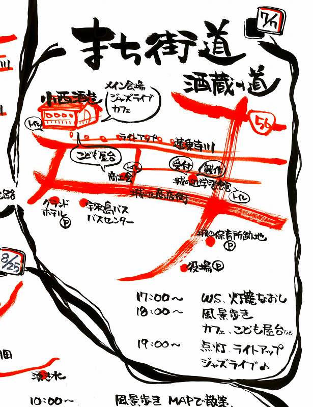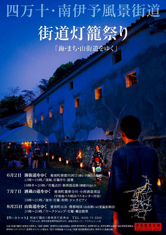 黄昏時の灯籠祭りをそぞろ歩くと、土佐和紙のちぎり絵うちわが光る!!というサプライズもあります。 浴衣を着て、灯籠のろうそくの灯りが揺れるまちの裡道を、手作りうちわを片手に楽しみませんか。 小西酒蔵は、灯籠と松明で明々と照らし出されます。 酒蔵前では、出店屋台で地元の特産バーベキューも生ビールも冷酒もと、大人の夏の宵を満喫出来ます。 酒蔵内では風景美術館や、大阪浪速のバンドEDFのジャズピアニスト清水武志さんの演奏を鑑賞。
