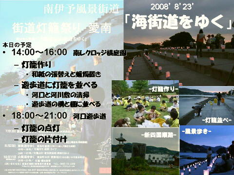 8月23日土曜日、2回目の「街道灯籠祭り愛南 海街道をゆく」を開催します。 遅くなりましたが、昨年の写真を添えて、街道灯籠祭り愛南実行委員会からご参加のお誘いを致します。 猛烈に暑かった平成20年の夏も、いよいよ終盤に・・・・ そこで、ゆく夏の名残を惜しみながら、まったりと夜風に吹かれてみませんか。